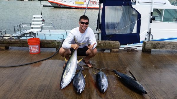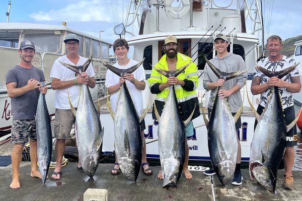 All sorts of big tasty fish! Yellowfin Tuna, Ono, Marlin, Skipjack Tuna and more are all possible. The time of year influences what you might catch so check out this fishing calendar